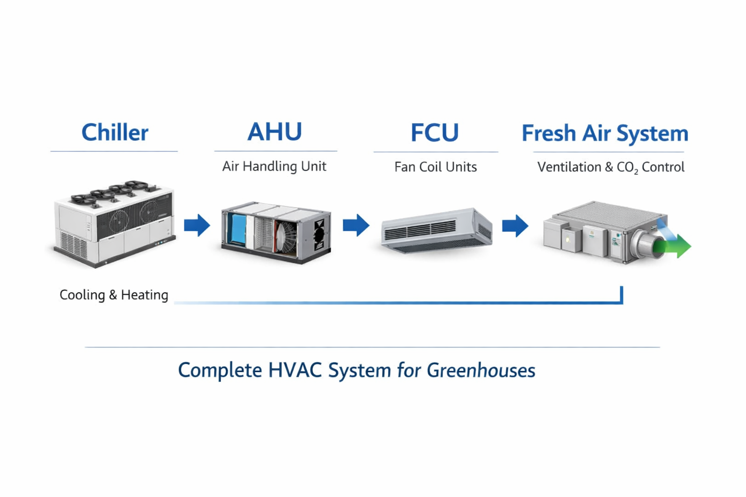A complete chilled water HVAC system for greenhouse typically includes the following: